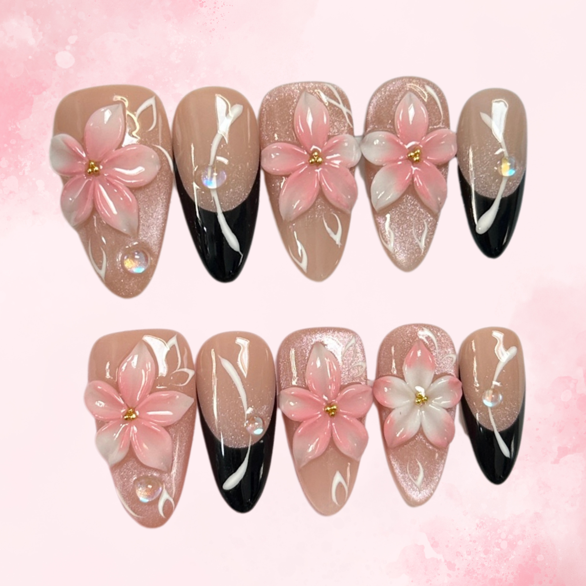 Midnight Blossom Short Almond Luxury Glue on Press on Nails
