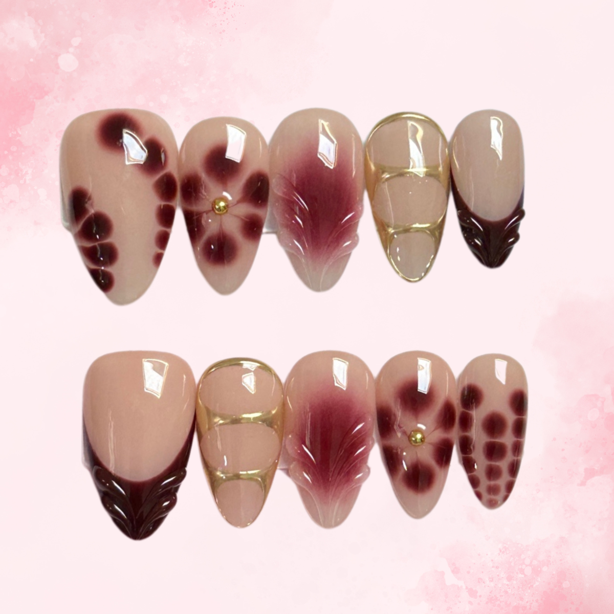 Each set has 10 pcs of Press-on nails and a Free application kit(Nail glue, Sticky tab, Nail file, and cuticle pusher). Within minutes- you'll have nails fit for a Queen!