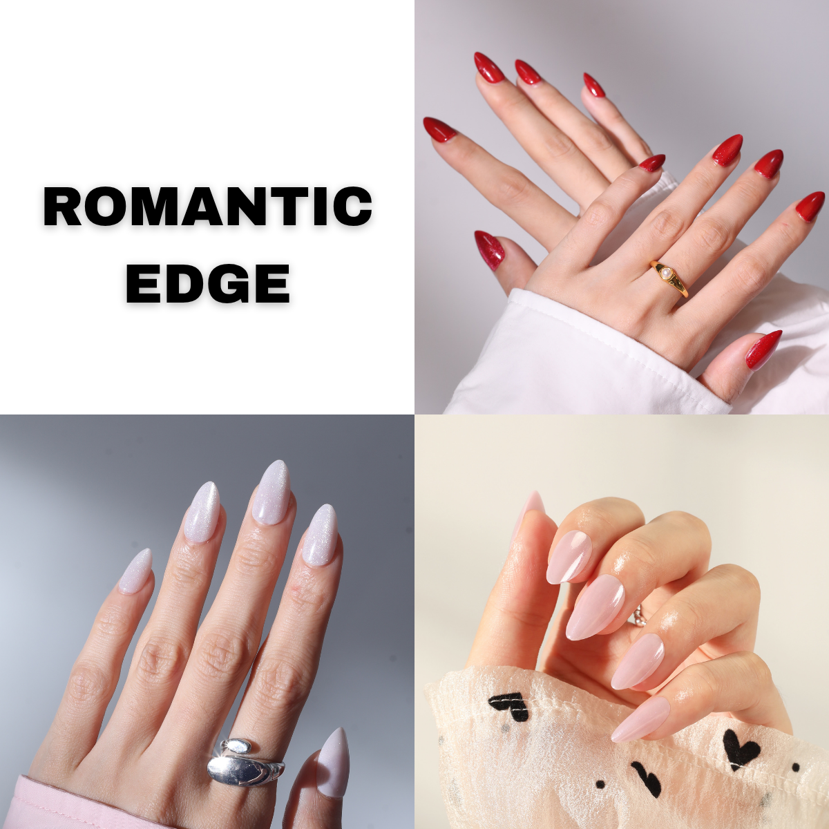Überschreiten Sie die Grenzen der Schönheit mit Romantic Edge – einem kuratierten Set aus drei Press-on-Nagelstilen, die romantische Sanftheit mit moderner Eleganz verbinden: