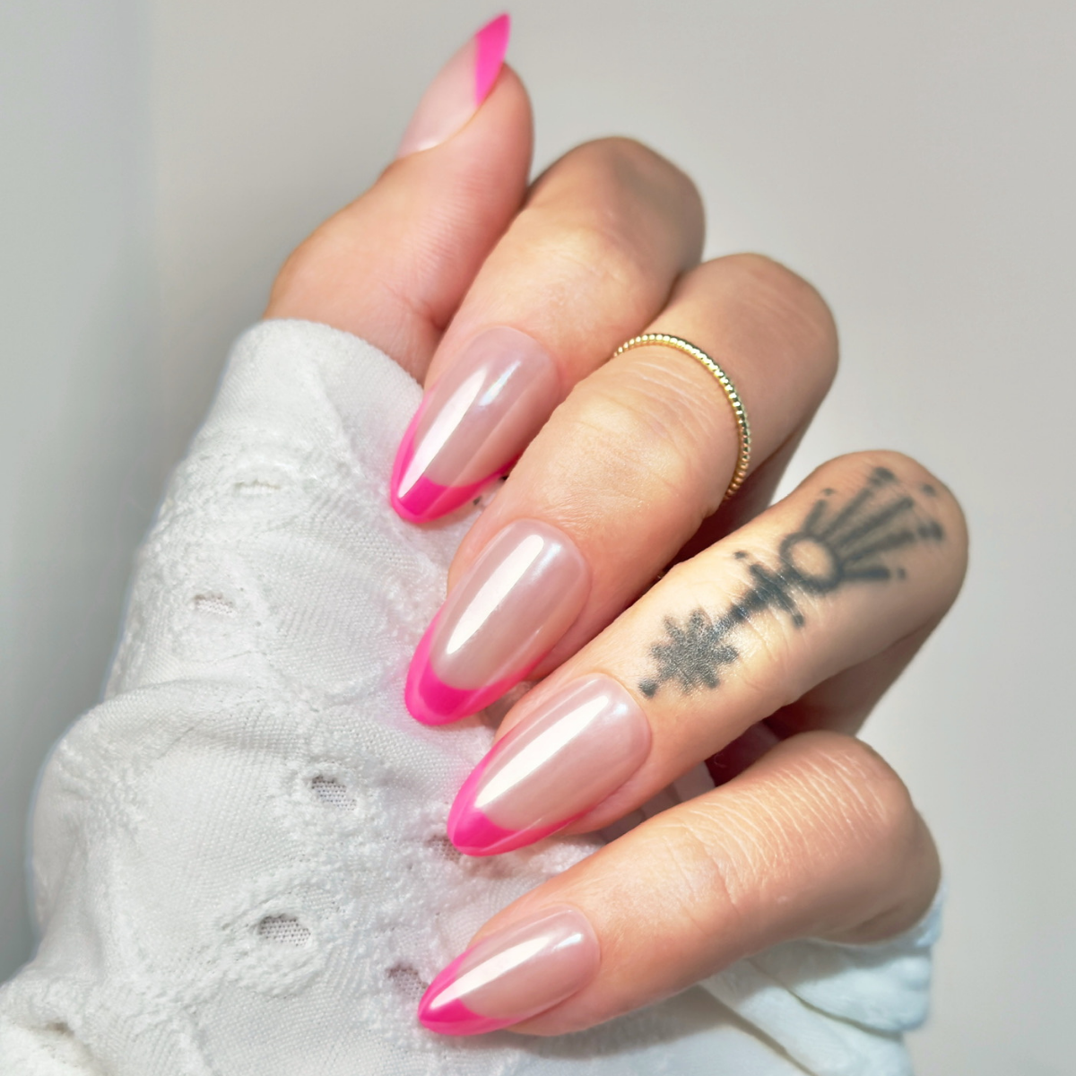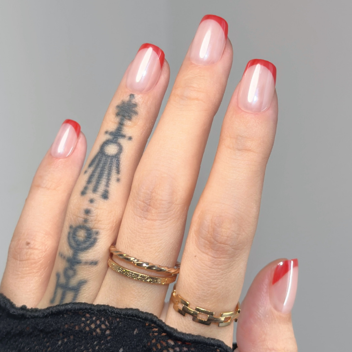 Eine verspielte Neuauflage der klassischen French-Tip-Nagelspitze mit kräftigen Farbtupfern in Pink, Rot, Gelb und Weiß. Sauber, schick und voller Persönlichkeit.