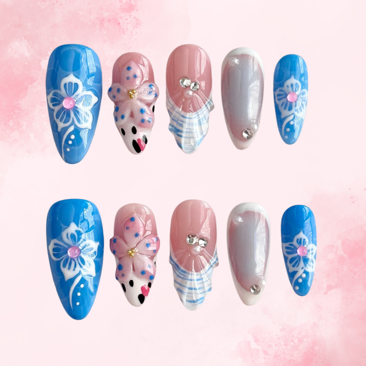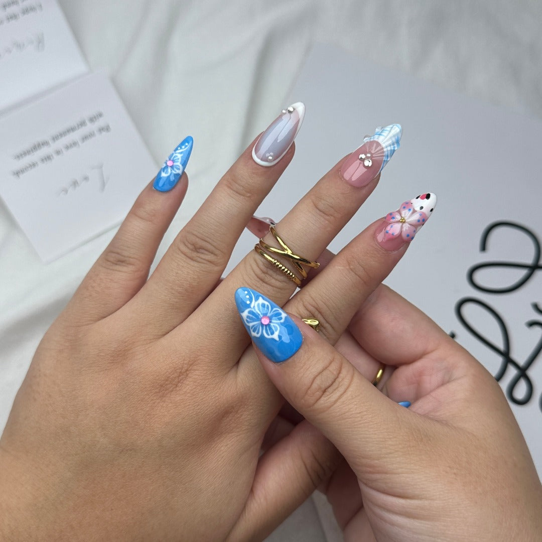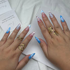 Each set has 10 pcs of Press-on nails and a Free application kit(Nail glue, Sticky tab, Nail file, and cuticle pusher). Within minutes- you'll have nails fit for a Queen!