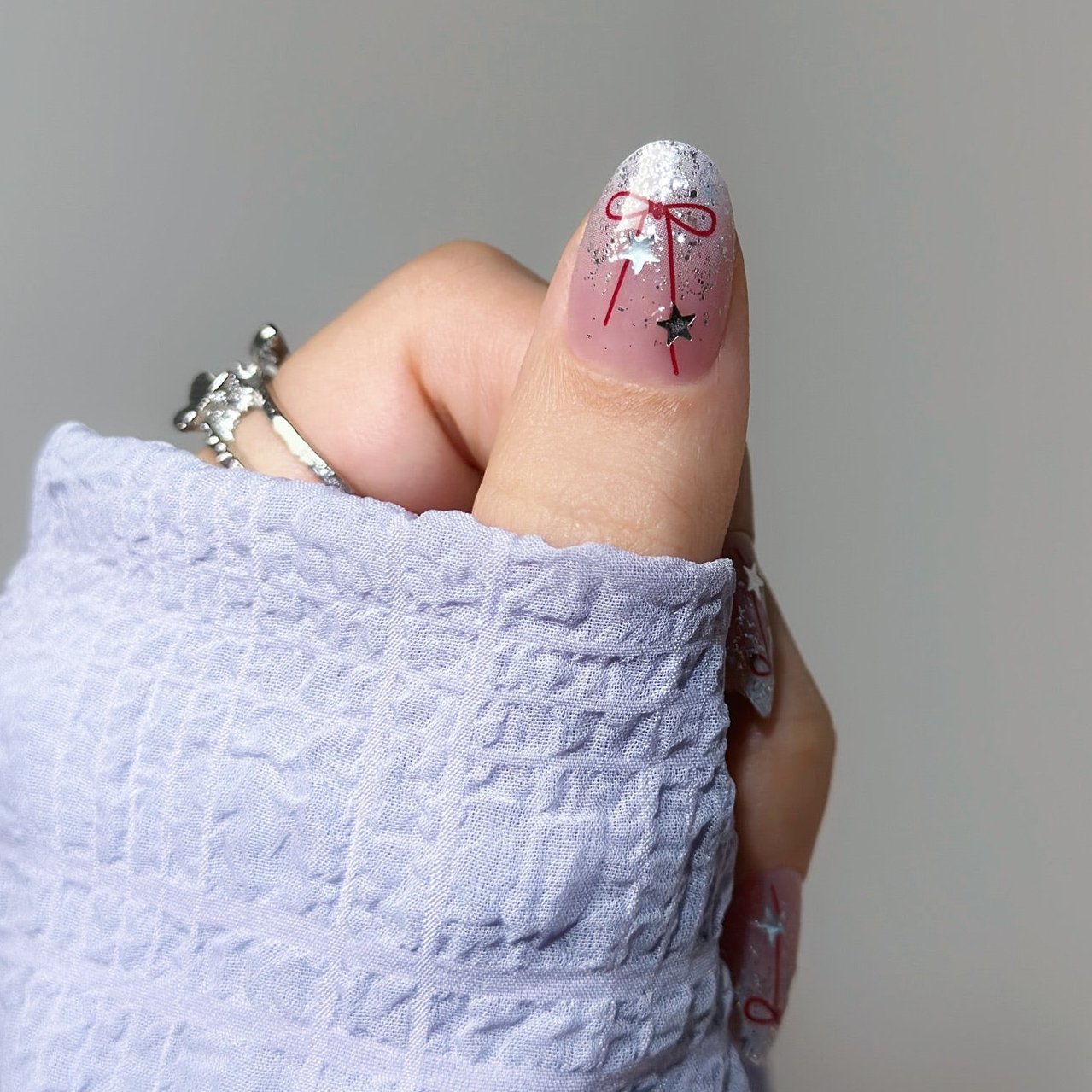 Festive sparkle meets elegance! 🎀✨ Short, chic nails with shimmering silver tips, playful red ribbon accents, and magical star details—perfect for a holiday-ready look! 💅