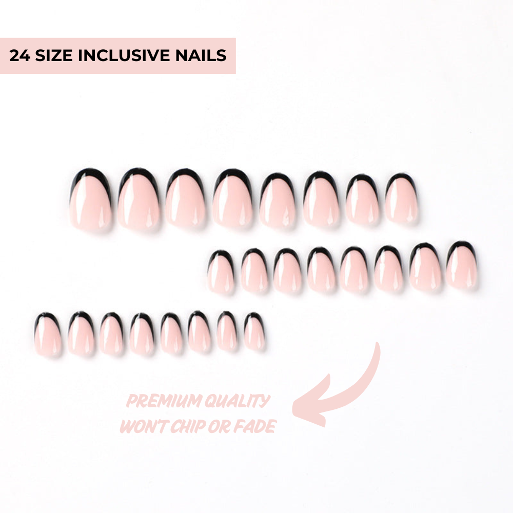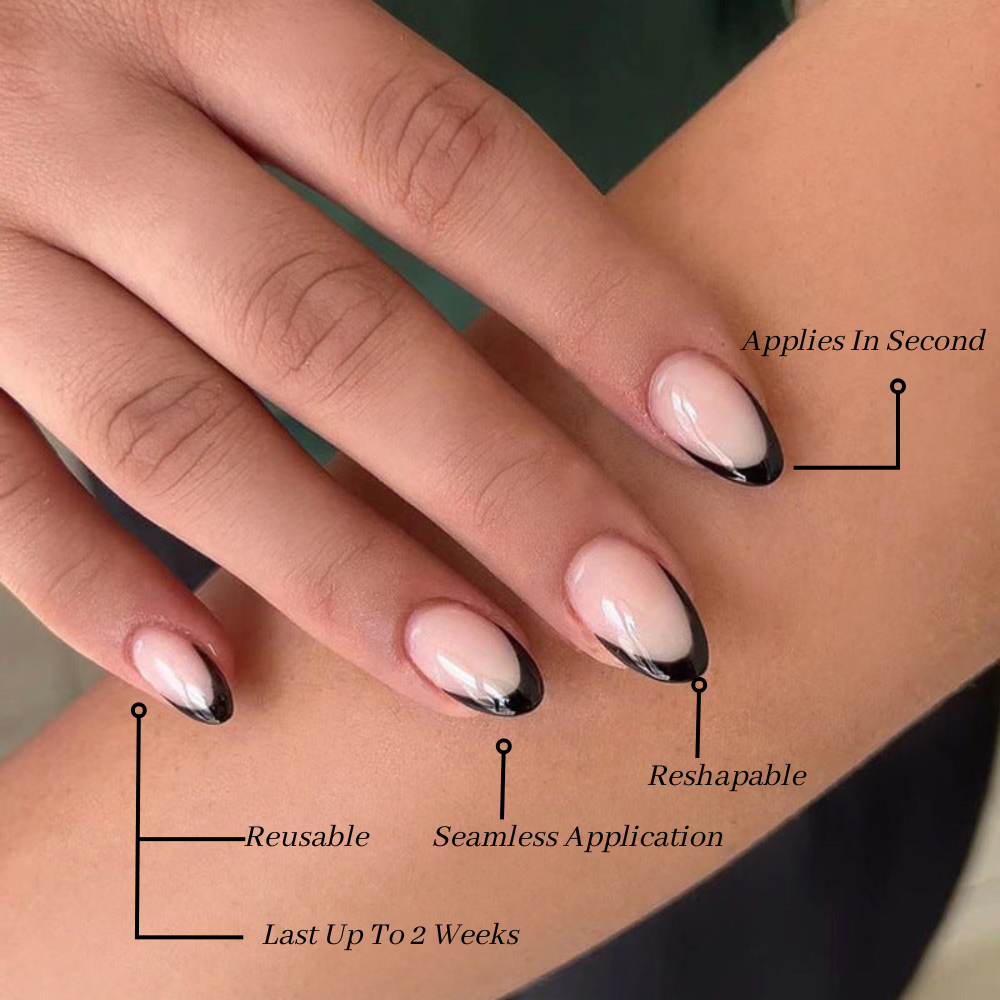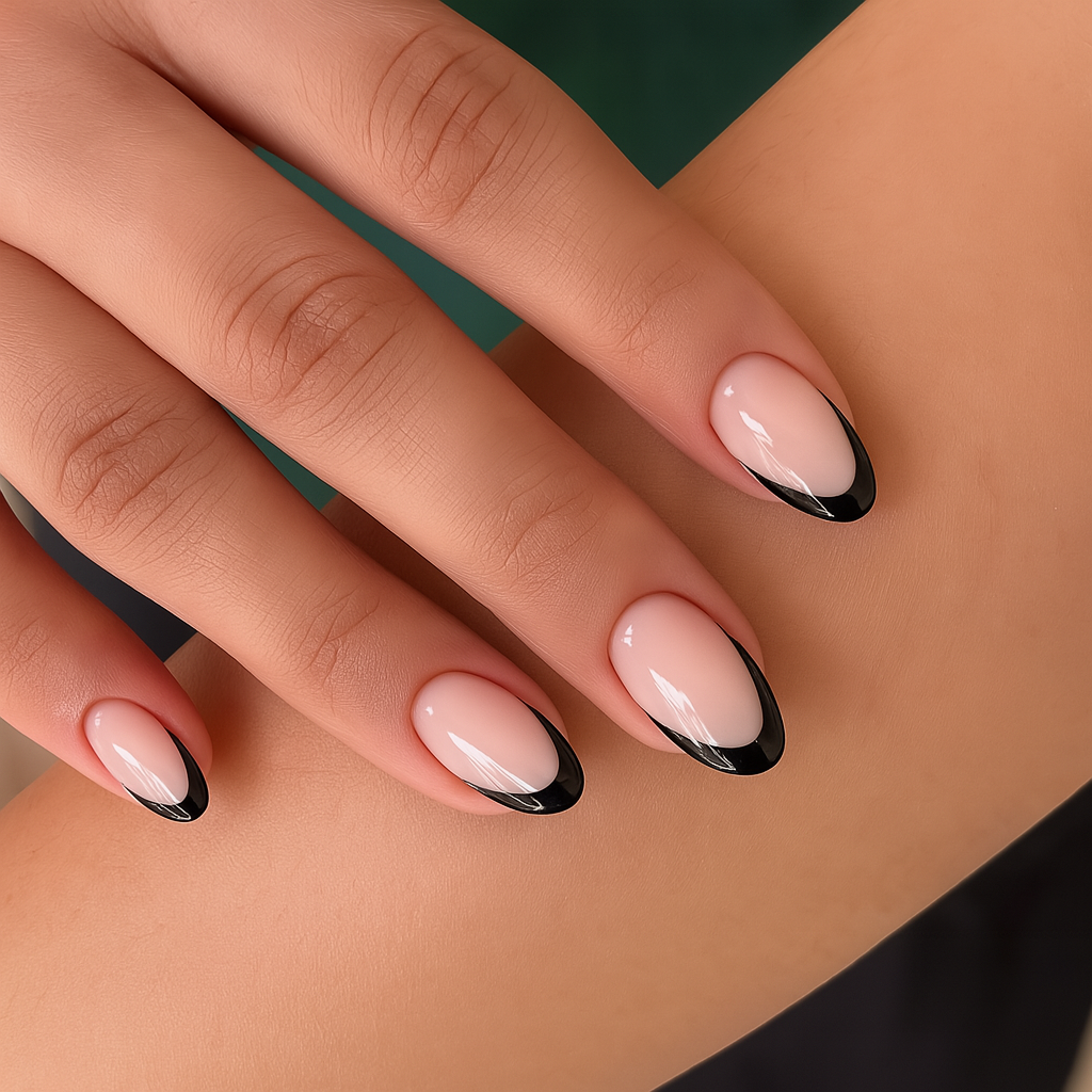Meet “Simple Black French Tip” 🖤 These almond-shaped nails feature a sleek black French tip, bringing a modern twist to a classic style. The contrast between the soft nude base and the bold black tips creates a look that’s both edgy and elegant. Perfect for those nights when you want to make a statement with your nails 🌙✨