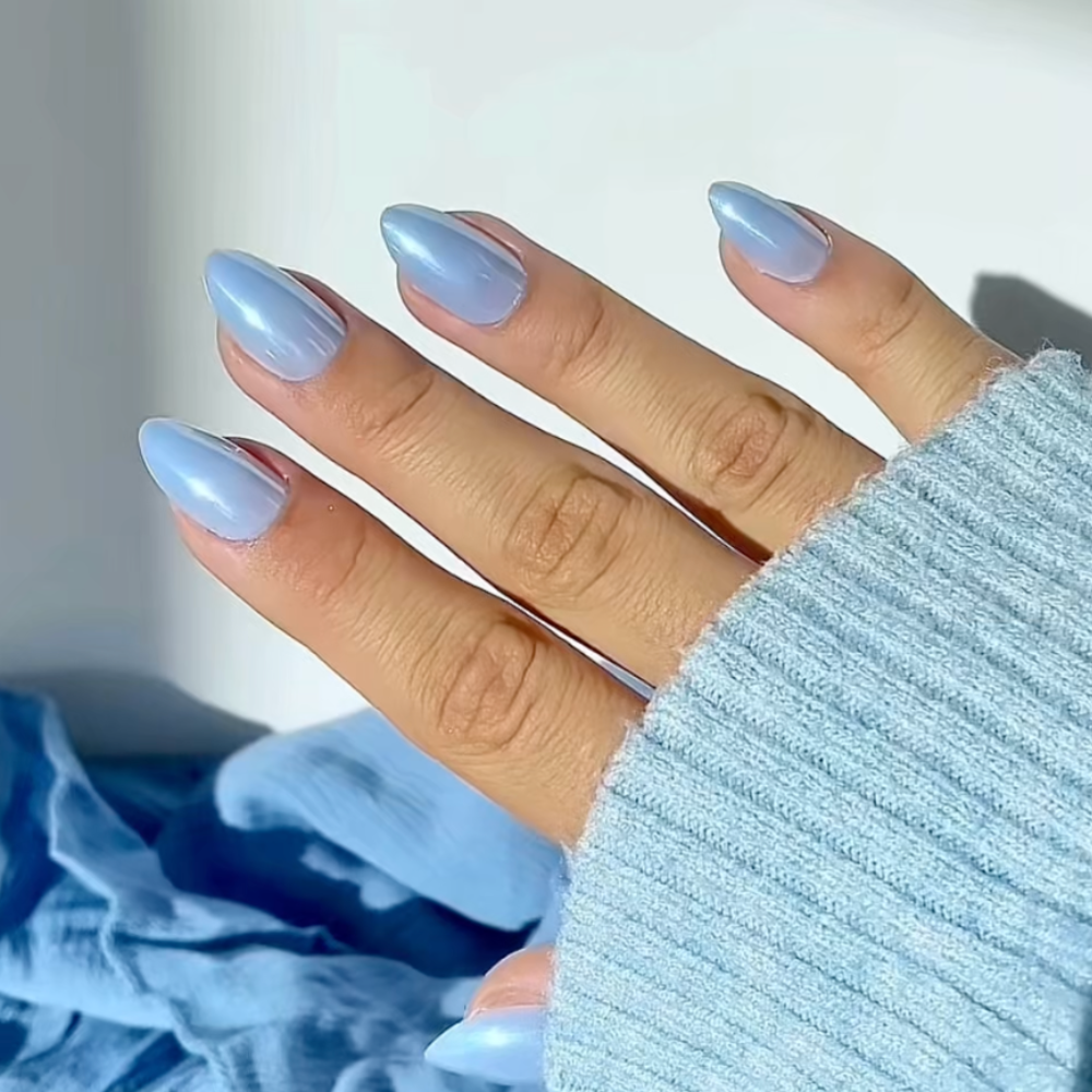 Découvrez « Blue Glazed » 🌙 Ces ongles en forme d'amande scintillent d'un bleu doux et irisé, rappelant la douce lueur du clair de lune. La brillance subtile ajoute une touche d'élégance, ce qui les rend parfaits pour toute occasion où vous souhaitez rayonner de calme et de sophistication. ✨