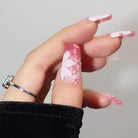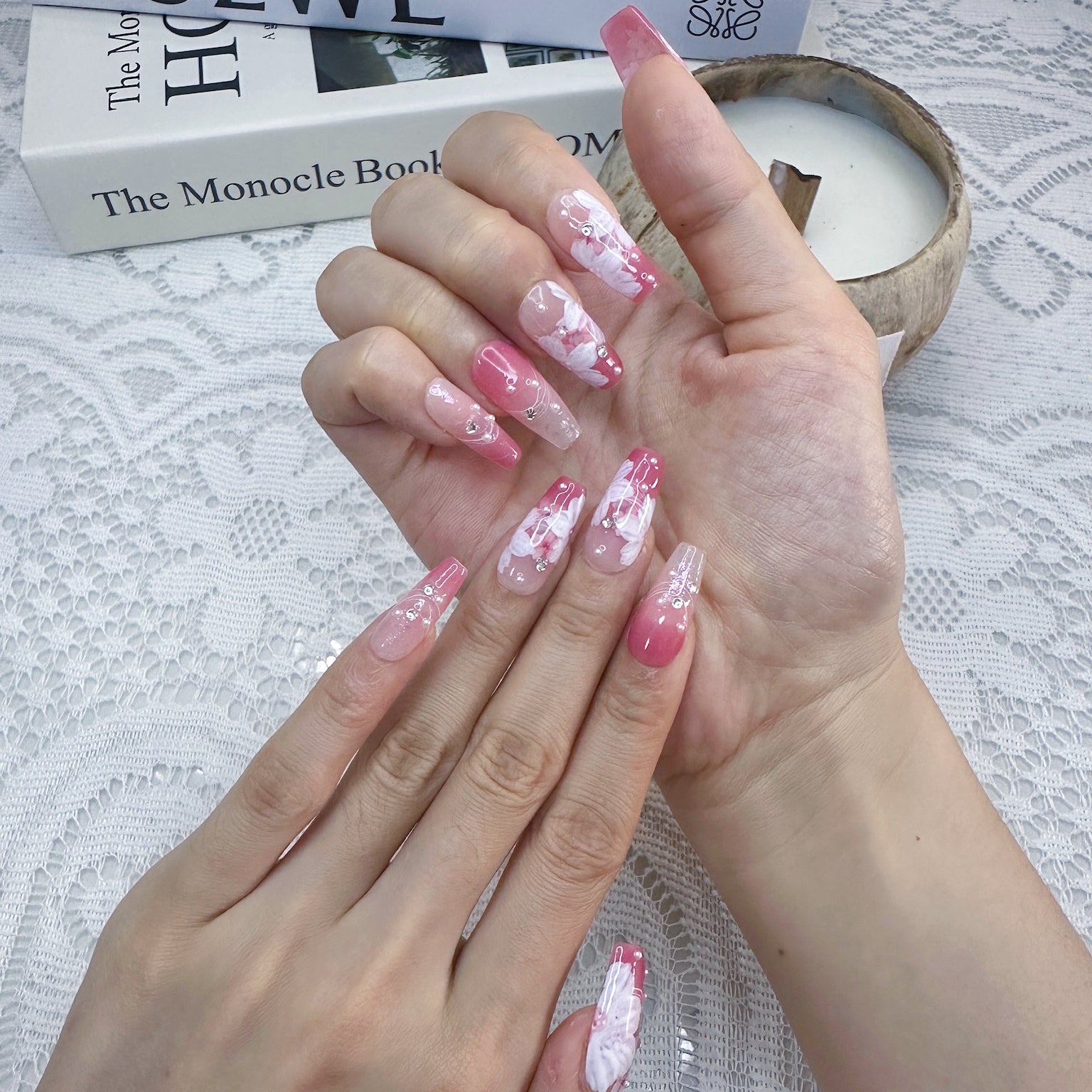 Ongles à coller longs en forme de cercueil à motif de fleurs de cerisier | Ongles faits main