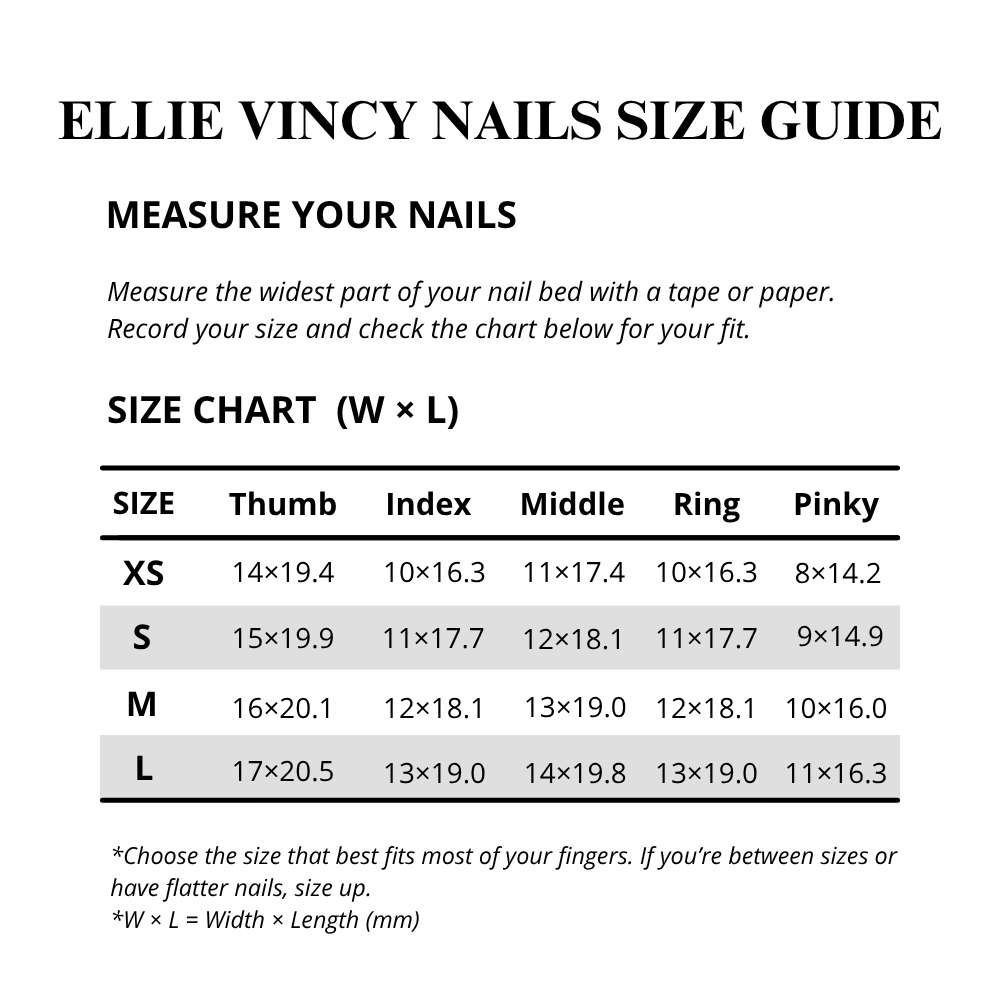 NOTE: PLEASE MEASURE YOUR NAIL SIZES BEFORE ORDERING. We don't offer a refund or return if you choose the wrong size.